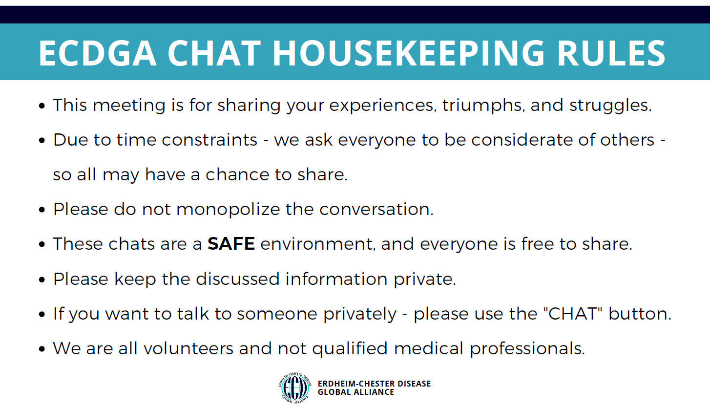 The ECD Global Alliance hosts virtual online chats each month for anyone in the ECD community. This includes patients, caregivers/carers, family members, medical personnel, researchers, etc.